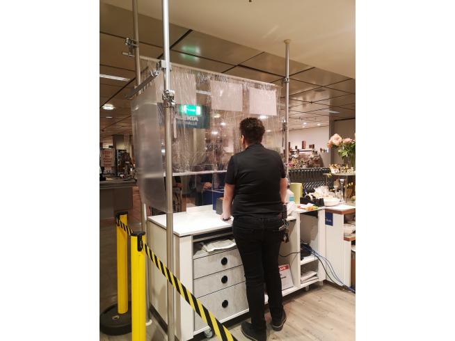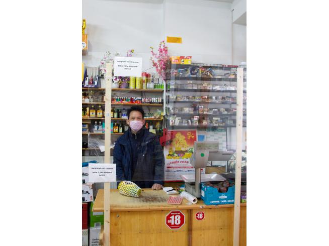 In an oval shape like a riot police helmet these objects fulfil their inherent purpose in their functionality. Some made from milky acrylic glass the interaction with the person beyond the counter gets a somehow cloudy, pixilated experience. Attached to the shelf with silver lined duct tape – an all time favourite of the DIY-workmansship – or hanging on thin strings almost invisible from the ceiling this objectoriented design, with its hands-on, low-material concept, facilitates a broader key element of our ever secure environment.