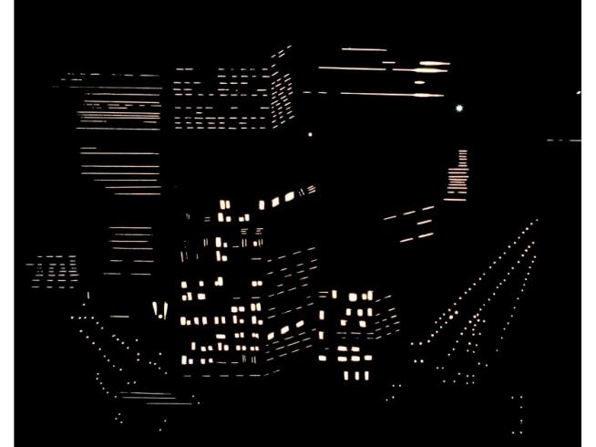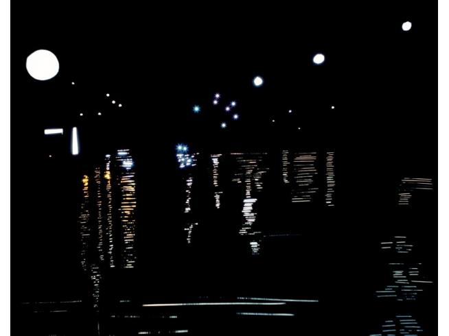 Man meint Straßenzüge und Gebäude zu erkennen, Autoscheinwerfer und Lichtwerbung, Spiegelungen auf dem Wasser. Aber je genauer man hinschaut, desto unwahrscheinlicher wird der scharfe Kontrast zwischen Schwarz und Weiß bzw. farbigen Lichtern. Plötzlich wirken auch die Formen der Lichter ein bisschen zu holzschnittartig. Man wird skeptisch - irgendwas stimmt hier nicht.