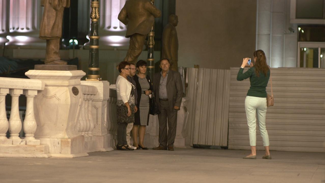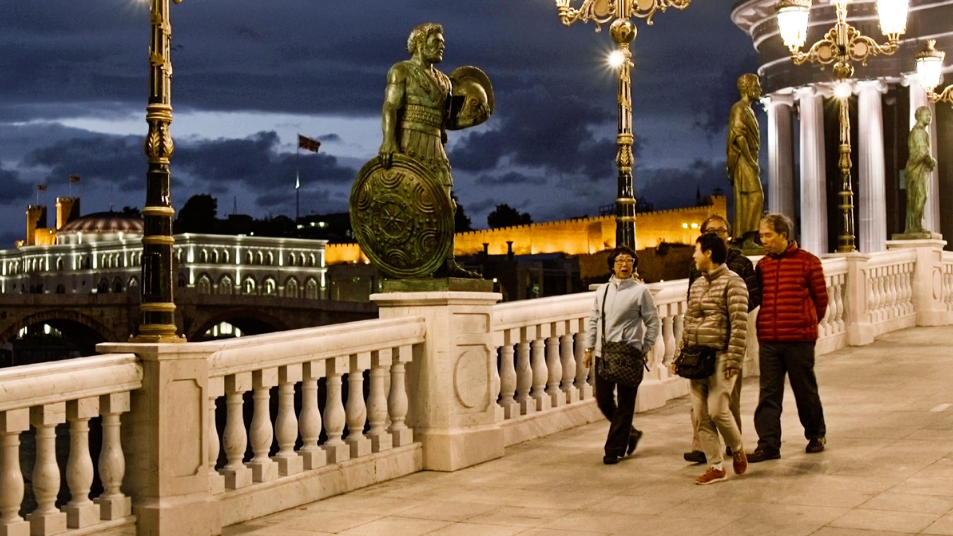 Die Bürger von Skopje schlendern ruhig, sie fotografieren sich gern, bleiben hier und da bei einer Statue stehen, zeigen auf etwas und unterhalten sich. Manche lehnen sich an den Zaun an und schauen von der Brücke auf den Fluss Vardar. Von dort aus sieht man barocke Häuser an denen sich weitere unzählige Statuen befinden. Ihre Kinder laufen glücklich und frei umher. Und immer wieder Fotos, Fotos, Fotos. Manche Leute wählen sich Figuren, mit denen sie porträtiert werden möchten. Das ganze Areal ist eine autofreie Zone. Ein Ort, sehr gut geeignet für einen Feierabendspaziergang. Er ist sehr aufwendig beleuchtet. Ein Ort, an dem man abschalten und die tagtäglichen Sorgen (für kurz) vergessen kann. Ein Ort, mit dem man etwas Angenehmes und Natürliches verbindet.