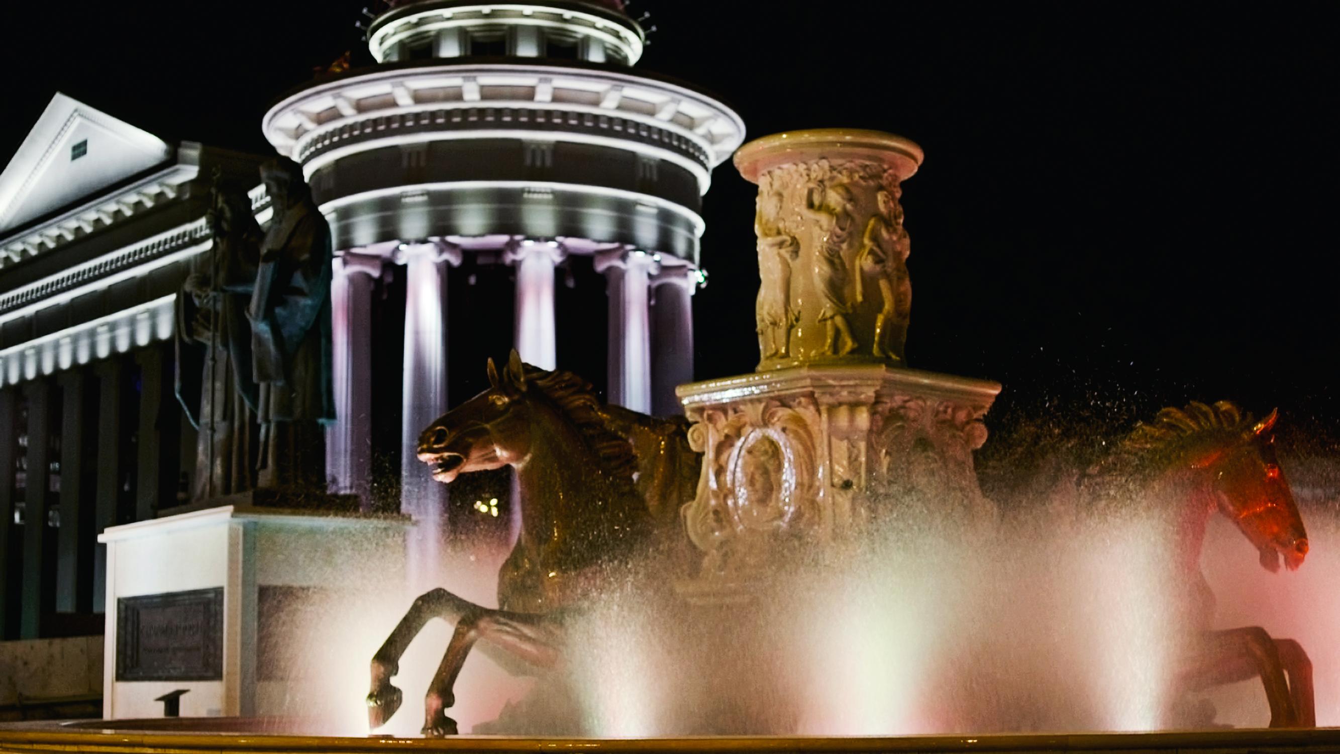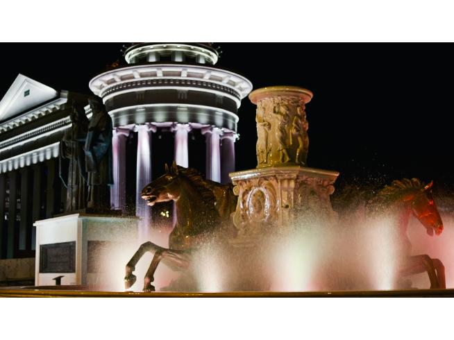 Einige dieser Monumente sind Fontänen, die synchron mit Musik bespielt werden. Mazedonische Ethnomusik, Wagner, Verdi und andere Größen unterstreichen die Gesten der nationalen Romantik, die auch in der Architektur integriert sind. Es sind uns Europäern sehr vertraute Gesten: Macht, Zärtlichkeit, Fürsorge, Kraft, Wissen, Sport, Spiritualität und Natur stellen ein gigantisches Ensemble zusammen. Eine Einheit, mit der sich die Dimensionen und die Bedeutung der Nation zu erkennen gibt. Das olympische Feuer brennt jetzt  auch in Skopje.