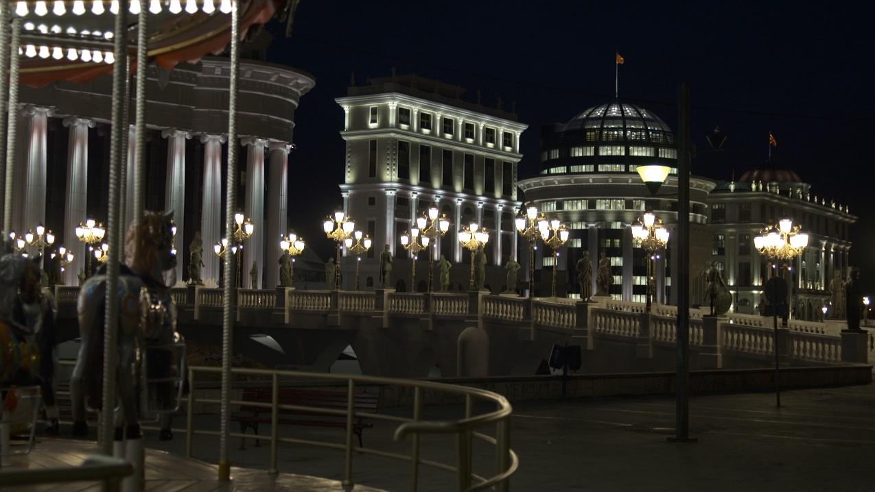 „Wo ist der Unterschied zwischen Skopje und Venedig? Venedig ist voll von authentischen Bauten, die nachweislich einst so prachtvoll gebaut wurden. Aber diese Häuser besitzen heute einen anderen Alltag. Diese Kulissenstadt, in der es fast nur noch ausgehöhlte Blendwerke gibt, die in ihrer Funktionalität dem Tourismus und der Industrie dienen müssen. An extended shopping mall. Eine Ausdehnung des Spektakels, wo auch die Echtheit nur ein Fake ist... Und das ist die große Ungerechtigkeit. Skopje ist ganz anders, es ist wirklicher als Venedig. Die Stadt, die zwar eine Imitation ist, dafür aber kein Blendwerk. Vielmehr, die historischen Imitate in Skopje sind staatstragend. Das heißt, sie werden so benutzt, wie sie einst benutzt worden sind. Das ist echt.