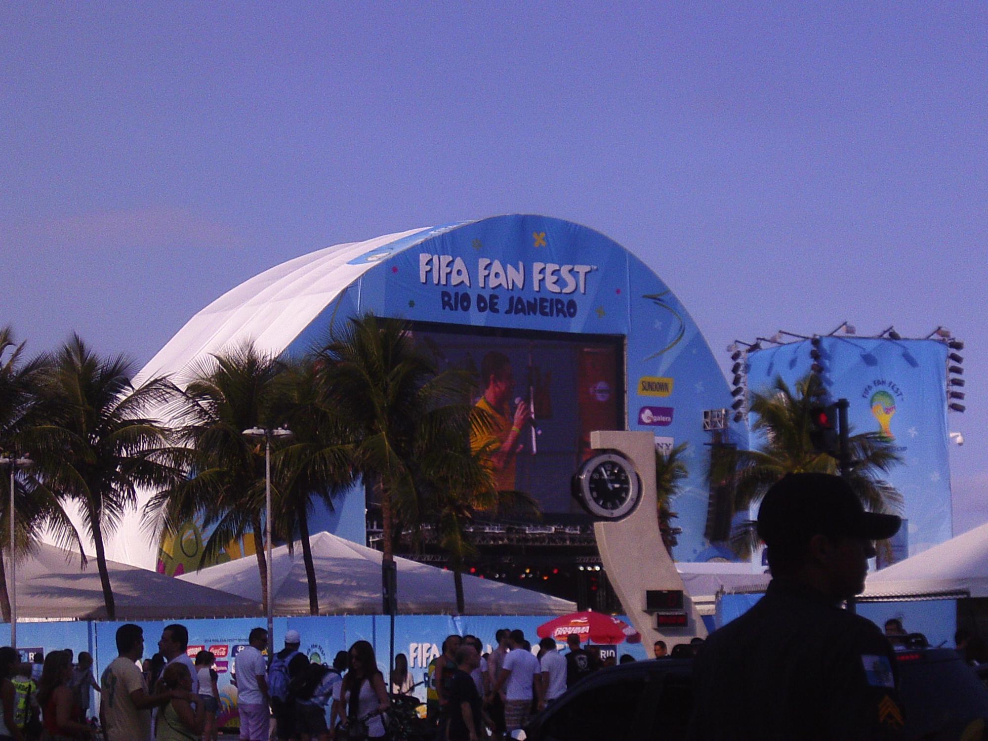Wie damals auf dem Dorffest wird das Feiern der Gemeinschaft von kommerziellen Interessen flankiert. Fußball lässt auch den Rubel rollen, das wird klar neben diesem Dorffest mit Metalldetektor. „Ordem e Progresso“-Fahnen haben hier Zugang, Transparente und Aktvismus „contrary to public order“ nicht. Vor meinem inneren Auge zerbröckeln die an der Copa gebauten Sandburgen, die an mittelalterliche Dörfer in Brasilienfarben erinnern, genauso wie damals die harmonische Gemeinschaft auf dem Dorfplatz. Der Zusammenhalt in Rio findet jenseits der Strandpromenade statt, zwischen den Comunidades auf den Hügeln.