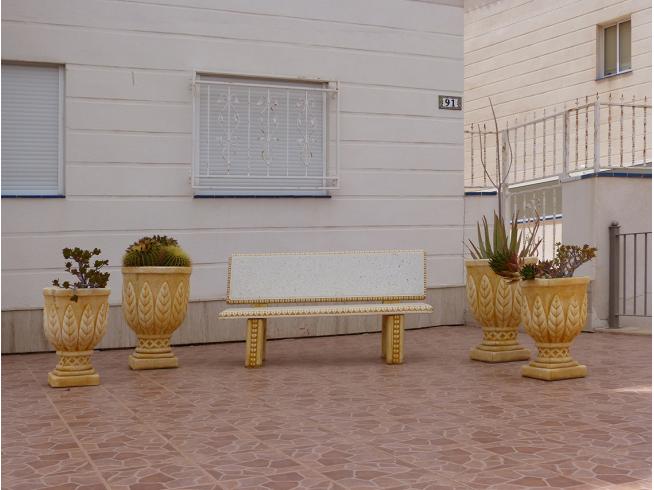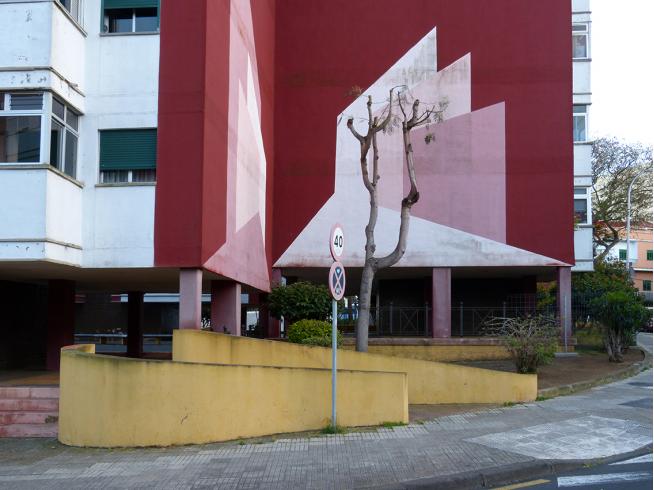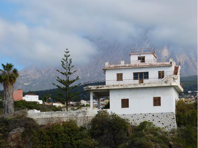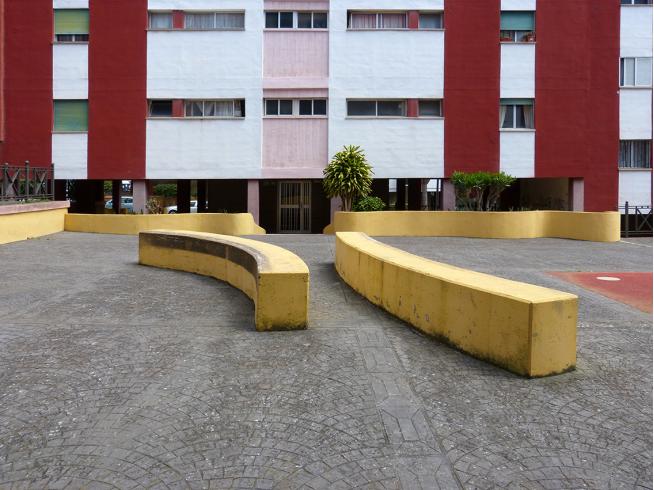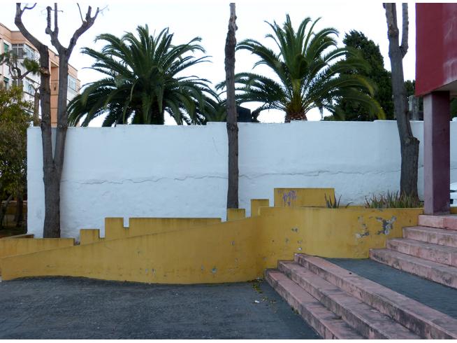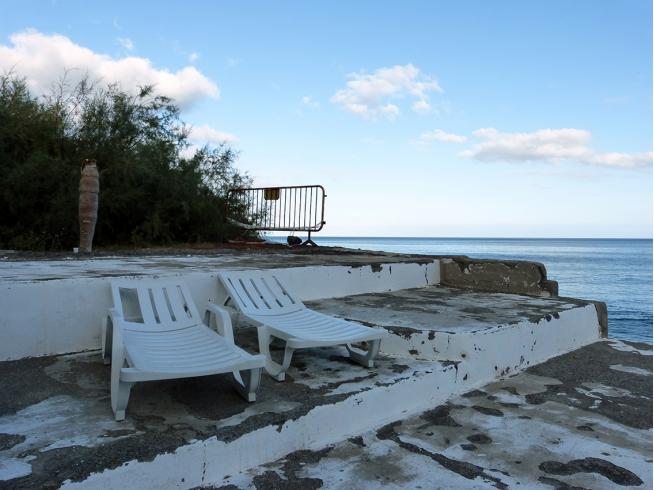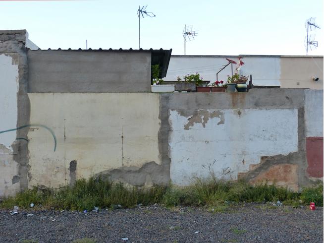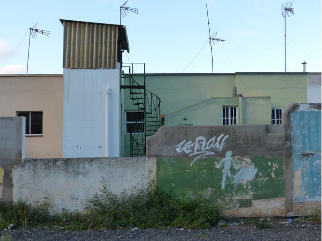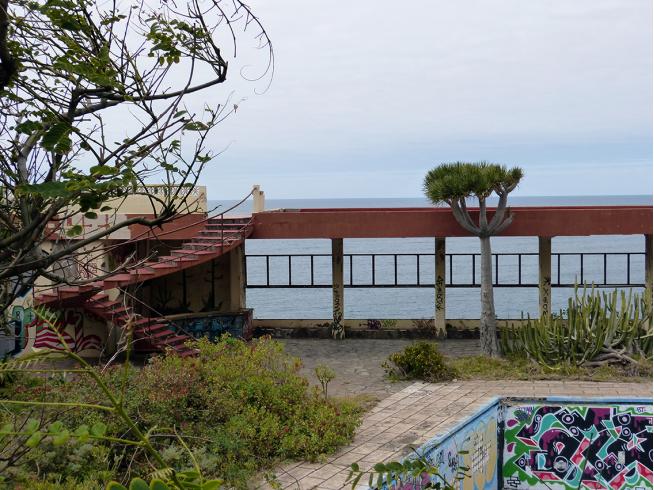 Teneriffa – Graffities im Pool – verkommene Hotelanlage – alter Glanz – Plastikliegen mit Lücken – gefleckter Boden (der Glanz ist ab) – orangener Plastik-Mülleimer auf weißer Wand – daneben Baustelle – geschwungene Mauer(-Landschaft) in orange / Sitzgelegenheiten (der Putz bröckelt) – 70er Jahre Betonbau – hellrosa / rosa / rotes Wandbild – sozialistische Moderne? – grüner /grauer / hellblauer Mauerputz / Zeitschichten – Häuserrückseiten – grob verputzter Beton – Antennen – aufgeräumtes Eck – goldig strahlende Sitzbank – aufstrebende Formen auf Pflanzenkübeln, Kakteen innendrin – Mini-Golf-Anlage in dunkelgrün – und dahinter das Meer – Ball-Auffang-Netz / Schutz-Zaun – schräge Palme – kein Mensch weit und breit.