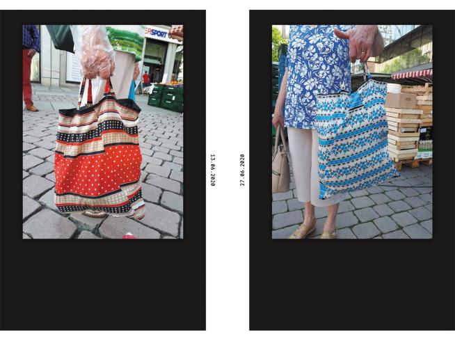 Als geldwerte Leistung für Sonderschichten erhielten die Arbeiterinnen des VEB Schirmfabrik Karl-Marx-Stadt Stoffreste aus zugeschnittener Schirmseide, die aus unterschiedlichen Gründen nicht mehr zu einem Schirm verarbeitet wurden. Aus den Teilen nähten sie u.a. Beutel und verkauften diese für etwa 2 Mark. Seit 2020 fotografiere ich während meiner Spaziergänge über den Chemnitzer Markt sogenannte Schirmbeutel. Mittlerweile ist die Sammlung auf über 150 Beutel unterschiedlicher Dessins angewachsen.