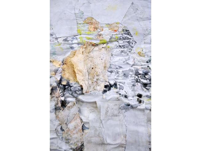 Übereinander gelegte Papierschichten, die aufgrund ihrer Dicke von der Wand abstehen. Ein Muster aus abgerissenen Schichten und einzelnen Papierfetzen, die erkennbar abstehen. Eine Papierschichtung in weiß-grau, mit verschwommenen Farbtupfern. Farbe, die sich in Kleister aufgelöst hat und hinunter läuft. Bilder, die an den Rändern ausfransen. Die Künstlerin Kirsten Heuschen sammelt Plakate oder besser: Plakatwände und verwendet deren Rückseiten, um daraus eigene Arbeiten zu formen. Eine Technik, die an die Décollage anknüpft, die Künstler*innen des Nouveau Réalisme in den 1950er und 60er Jahren entwickelt haben und die im Abreißen und Weiterverarbeiten von Plakaten bestand. Sie geht mit mehreren künstlerischen Schritten einher: Die Aneignung von alltäglichem Material, die Umwertung von Wertlosen und die Abstraktion von Botschaften, die uns in Form von Plakaten jeden Tag ansprechen und animieren wollen. Kirsten Heuschen geht noch einen Schritt weiter, indem sie das Collage-Material mit Cyanotypie und anderen Substanzen bearbeitet, so dass Chemigramme entstehen. Mit einer Emulsion malt sie dafür direkt auf die Plakatwände, die mit der fotografischen Substanz reagieren. Die Spuren des chemischen Prozesses werden sichtbar und bilden eine Analogie zu den Spuren, welche durch die körperliche Geste des Reißens der Plakate entstehen.