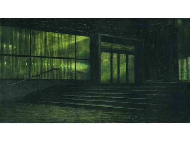 das wachpersonal, das ein bürogebäude nachts umläuft, kann und darf so nicht sehen, mit einem blick, dem man ansieht, dass er nichts sucht.