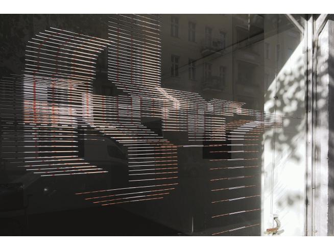 Birgit Hölmer: CUTS sind Interventionen an Schaufenstern leerstehender Ladenlokale. Sie bestehen aus Klebestreifen, die abstrakte Formen bilden. Durch die Anbringung auf Glas scheinen die CUTS je nach Lichteinfall wie im Raum zu schweben. Diese Interventionen habe ich seit 2015 meist unangemeldet durchgeführt. Seitdem sind Hunderte von CUTS in Berlin, anderen deutschen Städten und während Stipendienaufenthalten im europäischen Ausland entstanden. Die CUTS verbleiben nur für einen begrenzten Zeitraum bis sie von den Eigentümer*innen entfernt oder im Laufe der Zeit beschädigt werden oder sich von alleine auflösen.