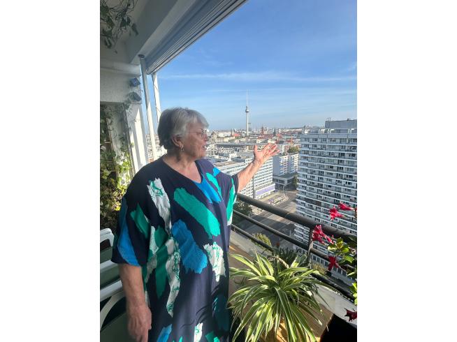 Kaum betreten wir die 4-Raum-Wohnung, sind wir schon in der gemütlichen Küche. Auf dem Tisch stehen Kaffee, süßes und salziges Gebäck – und mindestens sechs Fotoalben. Von der Küche geht es direkt ins Wohnzimmer und auf einen der zwei Balkone. Was für eine Aussicht man von hier oben hat!