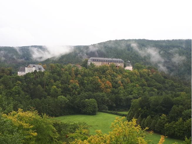 Wir bekommen eine Führung durchs halb verfallene Schloss Schwarzburg und seiner abenteuerlichen Geschichte: erst adliger Witwensitz, dann Komplettumbau durch die Nazis, der zu Dauerprovisorien und Zerstörungen führte, und nun Umbau in einen Lern- und Denkort für Demokratie.