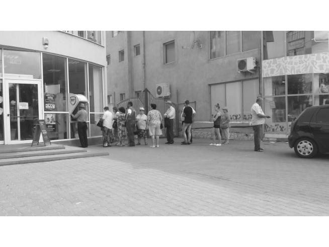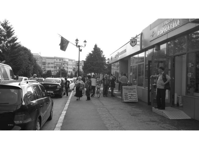 Die Situationen des Wartens werden vor allem durch die starken sozialen und finanziellen Verbindungen zu den in der Diaspora lebenden Personen geprägt, die, obwohl sie nicht da sind, trotzdem präsent sind.[15] Unterschiedliche Rhythmen überschneiden sich und werden im Stadtraum sichtbar. Vor allem am Montagmorgen, noch vor neun Uhr, formen sich Menschenschlangen vor der »Banca Comercială Română« und der »Banca Transilvania«. Schon um 8:30 warten Frauen mit Kindern oder einzelne Männer auf dem Gehsteig und tauschen sich dabei aus. Vor den Geldautomaten formen sich eher nachmittags Menschenschlangen. Die Geldsendungen sind wirtschaftliche Transaktionen, die zwei Personen und zwei Orte verbinden.[16] Im Jahr 2007 lag die Höhe der Geldsendungen aus dem Ausland nach Rumänien bei 7,2 Milliarden Euro, was ca. 6% des Bruttoinlandsproduktes ausmachte.[17]