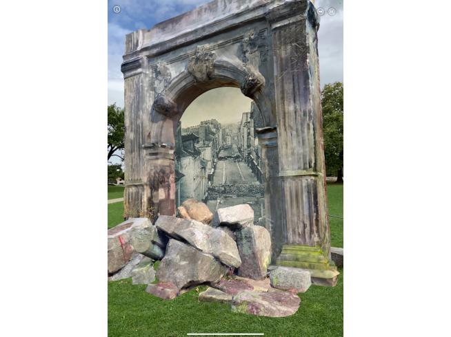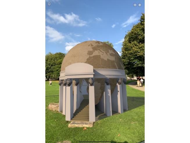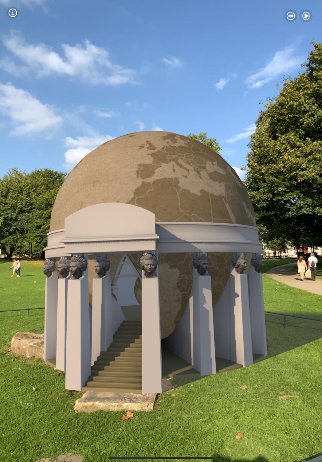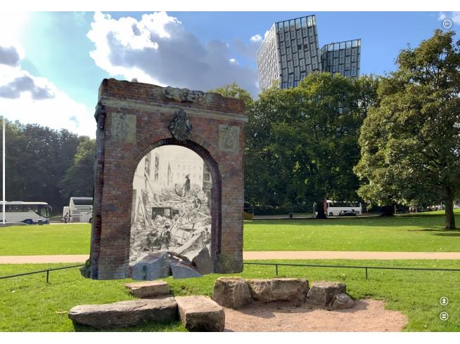 Ein Passant kommt mit seinem Hund vorbei, der schnüffelt neugierig am Zaun und hebt kurz sein Hinterbein. Ich bin mit Eske Schlüters und Tillmann Terbuyken hier verabredet, die Künstler sind dafür verantwortlich, dass sich diese Installation hier befindet. Sie haben ein Tablet und Kopfhörer mitgebracht, denn bei Untitled History handelt es sich um eine zweiteilige Arbeit, aus einem physischen und einem digitalen Teil. Auf dem Tablet ist die Augmented Reality-App bereits installiert, die ich sonst über den QR-Code herunterladen könnte. Mit dem Öffnen der APP beginnt eine ca. 15 min virtuelle Reise, bei der sich vor mir historische Gebäude und Phantasiegebilde aufbauen, um im nächsten Moment wieder zu verschwinden. Es ist eine eigenartige Erfahrung: Auf dem Tablet sehe ich den realen Umraum, der zugleich Schauplatz einer künstlerischen Zeitreise ist. Gleichzeitig spüre ich die Blicke von Passant*innen auf mir – kein Wunder, so ungewohnt, wie ich mich hier (nicht-)bewege.