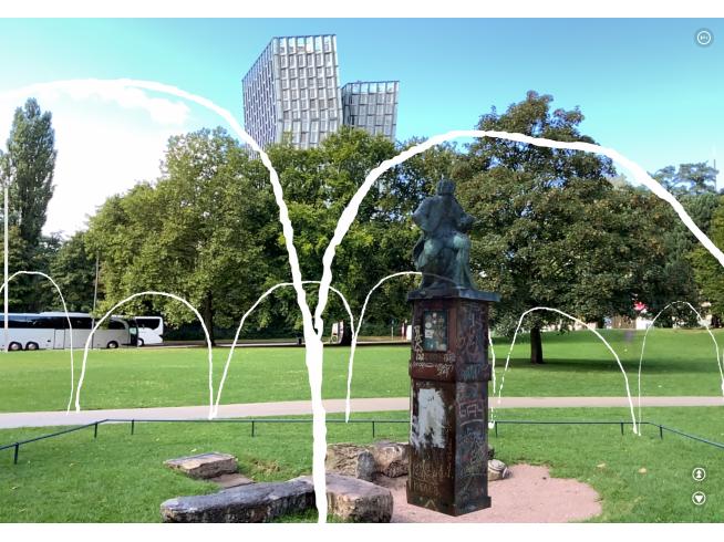 Die Verschränkung einer ortsspezifischen Kunst im öffentlichen Raum-Arbeit und einer digitalen Ebene überzeugt ebenso wie die Kombination aus starker skulpturaler Setzung und inhaltlicher Tiefe wie spielerischer Vermittlung in der AR. Uneinig sind wir bei der Frage, ob auf der Tafel nicht noch ein Hinweis auf die Augmented Reality hilfreich gewesen wäre, weil man üblicherweise durch einen QR-Code auf einer Website mit Infotext landet, hier aber ein zentraler Teil des Kunstwerks nur über den Code abruf- und erfahrbar wird. Den Künstler*innen war es jedoch wichtig, nicht zu viel vorwegzunehmen und zu erklären. Tatsächlich finde ich das Fragmenthafte und Offene der Arbeit produktiv, lässt es doch Spielraum für eigene Assoziationen und regt zur Selbstbefragung an. Was ist eigentlich mein Beitrag zur Demokratie?, frage ich mich unmittelbar nach dem Hören von Karl Gutzkows Aufruf von 1848, mit dem die AR endet: