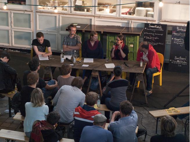 Im August haben wir zunächst im Hamburger Gängeviertel die Ausstellung von Denis Sennefelders Fotoserie Gegen Ende präsentiert und nur zehn Tage später eine lebhafte und kontroverse Podiumsdiskussion zum Thema Wem gehört der Markt? Neue Märkte für ein besseres Miteinander? in der Markthalle IX in Kreuzberg ausgerichtet. Wollten wir einerseits die durch unsere Artikel angestoßenen Diskussionen und Gespräche noch einmal mit einer breiteren Öffentlichkeit diskutierten, ging es uns anderseits darum, konkrete Vorschläge für die Diversifizierung der Markthalle vorzustellen. Gäste waren Matthias Clausen von der Mietergemeinschaft Kotti & Co, die Sozialwissenschaftlerin Christiane Droste und der Markthallenbetreiber Florian Niedermeier.[v] Hier schließt sich der Kreis zu unseren ersten Reportagen über die Kreuzberger Markthalle IX.