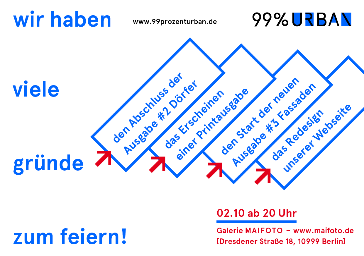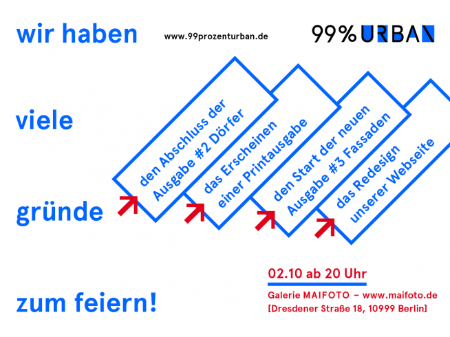 Unsere Ausgabe # 3 beschäftigt sich mit Fassaden. Aber eben nicht nur mit der Außenhaut von Gebäuden der urbanen Prachtstraßen Unter den Linden, der Fifth Avenue, den Champs-Élysées oder neuen Schlossfassaden. Es geht auch um Masken, um Fassaden im urbanen Alltag, seien es nun Orte, Gruppen und Milieus zur Selbstdarstellung oder auch die Sozialen Medien. Zum Start der Ausgabe # 3 Fassaden feiern wir auch den Abschluss der Ausgabe # 2 Dörfer. Auszüge daraus erscheinen als limitierte Printausgabe, die bei der Feier erhältlich ist.