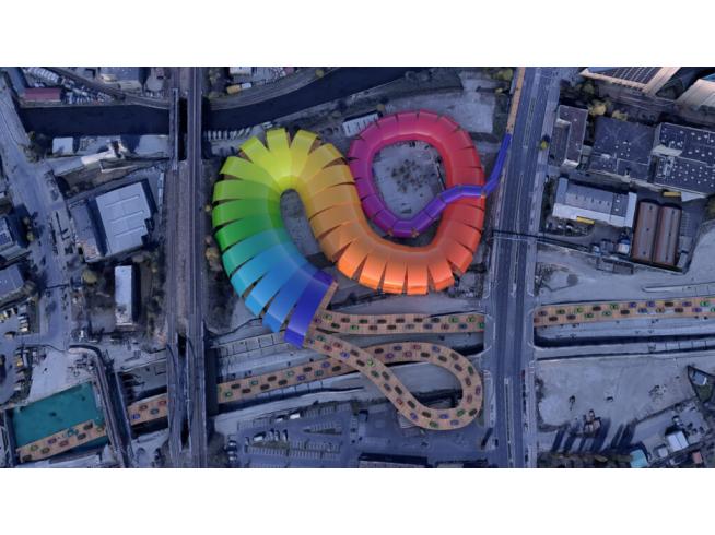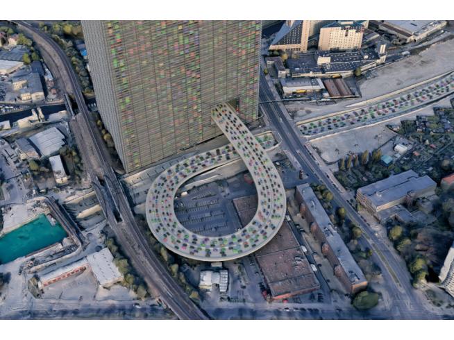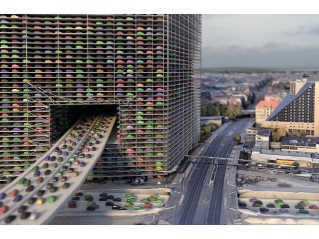 Mit seiner Größe von rund 4,5 Millionen Quadratmetern und einer Höhe von 420 m ist das Gebäude an der südlichen Seite der Sonnenalle das höchste Parkhaus der Welt. Die 150 Parkdecks mit den rund 200.000 Parkplätzen bieten somit Platz für alle in Neukölln zugelassenen PKW. Das Parkhaus ist die Lösung für ein autofreies Berlin-Neukölln. Durch die direkte Zufahrt über die A 100 ist es zu jeder Tages- und Nachtzeit erreichbar.