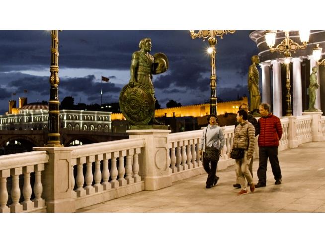 Die Bürger von Skopje schlendern ruhig, sie fotografieren sich gern, bleiben hier und da bei einer Statue stehen, zeigen auf etwas und unterhalten sich. Manche lehnen sich an den Zaun an und schauen von der Brücke auf den Fluss Vardar. Von dort aus sieht man barocke Häuser an denen sich weitere unzählige Statuen befinden. Ihre Kinder laufen glücklich und frei umher. Und immer wieder Fotos, Fotos, Fotos. Manche Leute wählen sich Figuren, mit denen sie porträtiert werden möchten. Das ganze Areal ist eine autofreie Zone. Ein Ort, sehr gut geeignet für einen Feierabendspaziergang. Er ist sehr aufwendig beleuchtet. Ein Ort, an dem man abschalten und die tagtäglichen Sorgen (für kurz) vergessen kann. Ein Ort, mit dem man etwas Angenehmes und Natürliches verbindet.