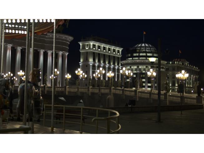 „Wo ist der Unterschied zwischen Skopje und Venedig? Venedig ist voll von authentischen Bauten, die nachweislich einst so prachtvoll gebaut wurden. Aber diese Häuser besitzen heute einen anderen Alltag. Diese Kulissenstadt, in der es fast nur noch ausgehöhlte Blendwerke gibt, die in ihrer Funktionalität dem Tourismus und der Industrie dienen müssen. An extended shopping mall. Eine Ausdehnung des Spektakels, wo auch die Echtheit nur ein Fake ist... Und das ist die große Ungerechtigkeit. Skopje ist ganz anders, es ist wirklicher als Venedig. Die Stadt, die zwar eine Imitation ist, dafür aber kein Blendwerk. Vielmehr, die historischen Imitate in Skopje sind staatstragend. Das heißt, sie werden so benutzt, wie sie einst benutzt worden sind. Das ist echt.