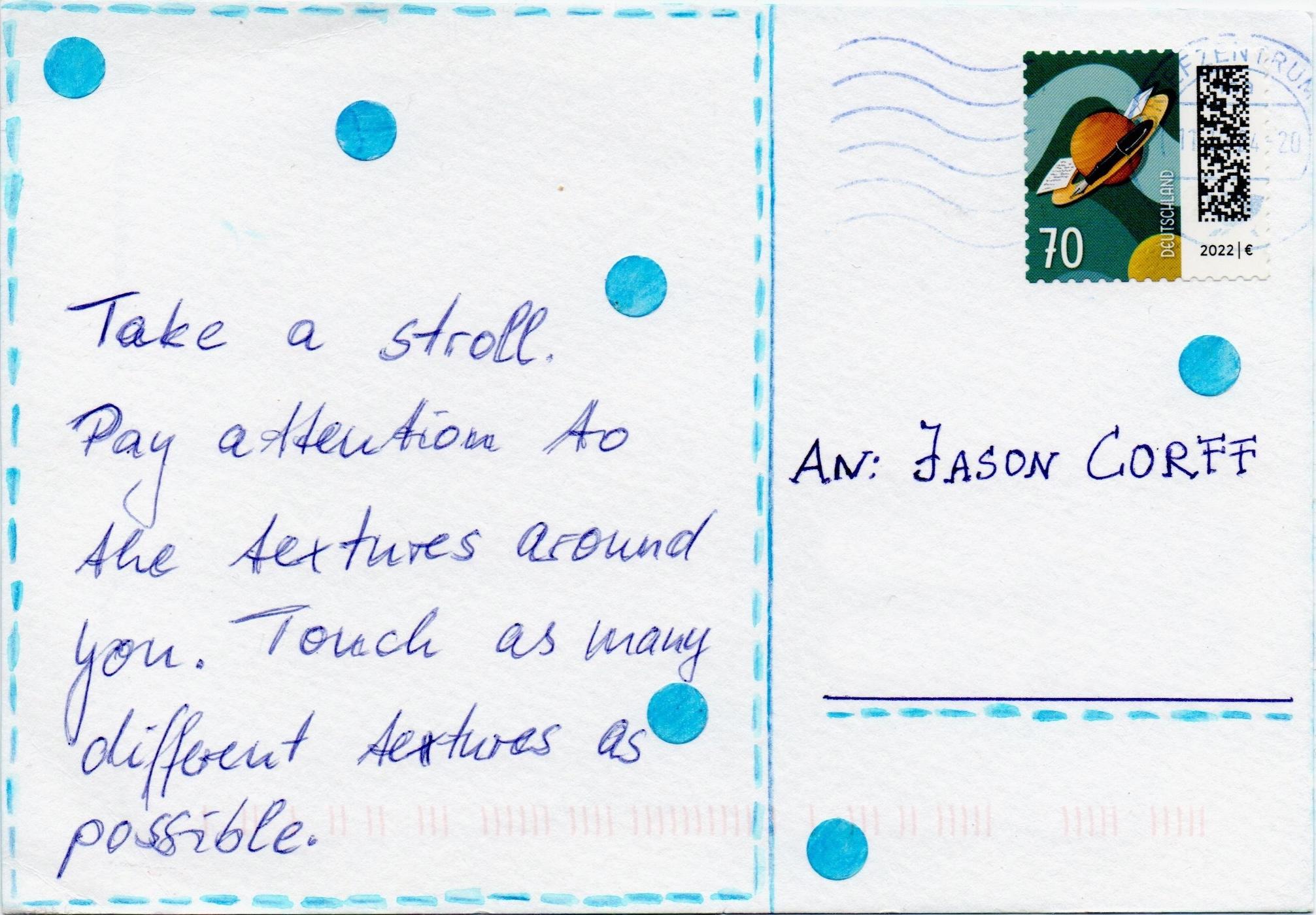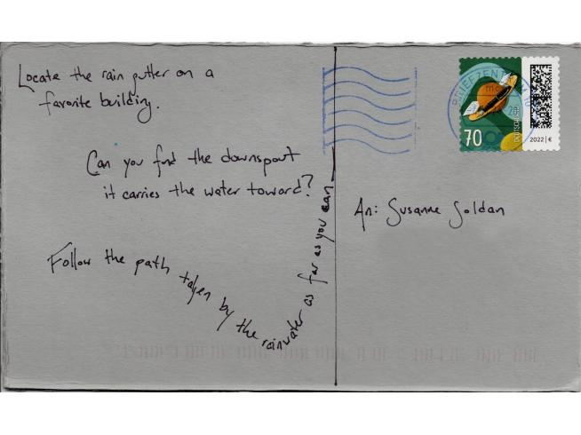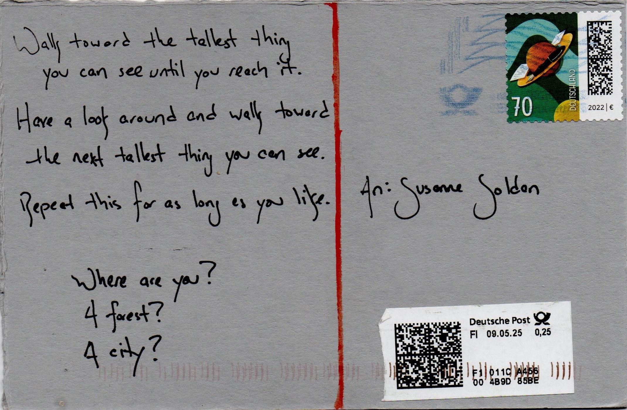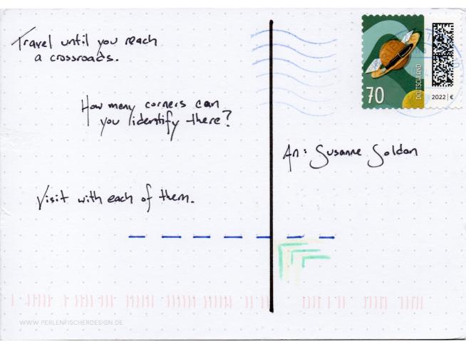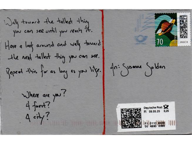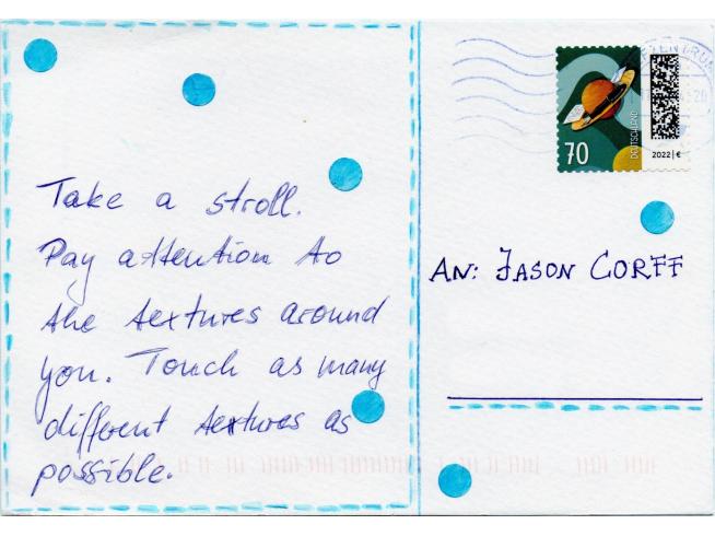[EN] A playful, artistic critique of tourism and the motif of the postcard, Field Notes from Elsewhere focuses on the unexpected, unique, and subtly spectacular nature of surroundings. Informed by mail art as well as the Situationist and Fluxus movements, the project creates a form of structured drifting. This approach to exploration encourages a participant to perceive (un)familiar places differently than is typical in everyday life. What is uncovered during these actions cannot be predicted in advance, and intends to reveal surprises particular to each location and/or journey. Each Field Note is written with instructions for a task on how to explore or experience your current location in a new way. These handmade postcards are sent via mail between Jason Corff and Susanne Soldan.