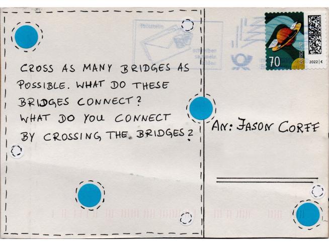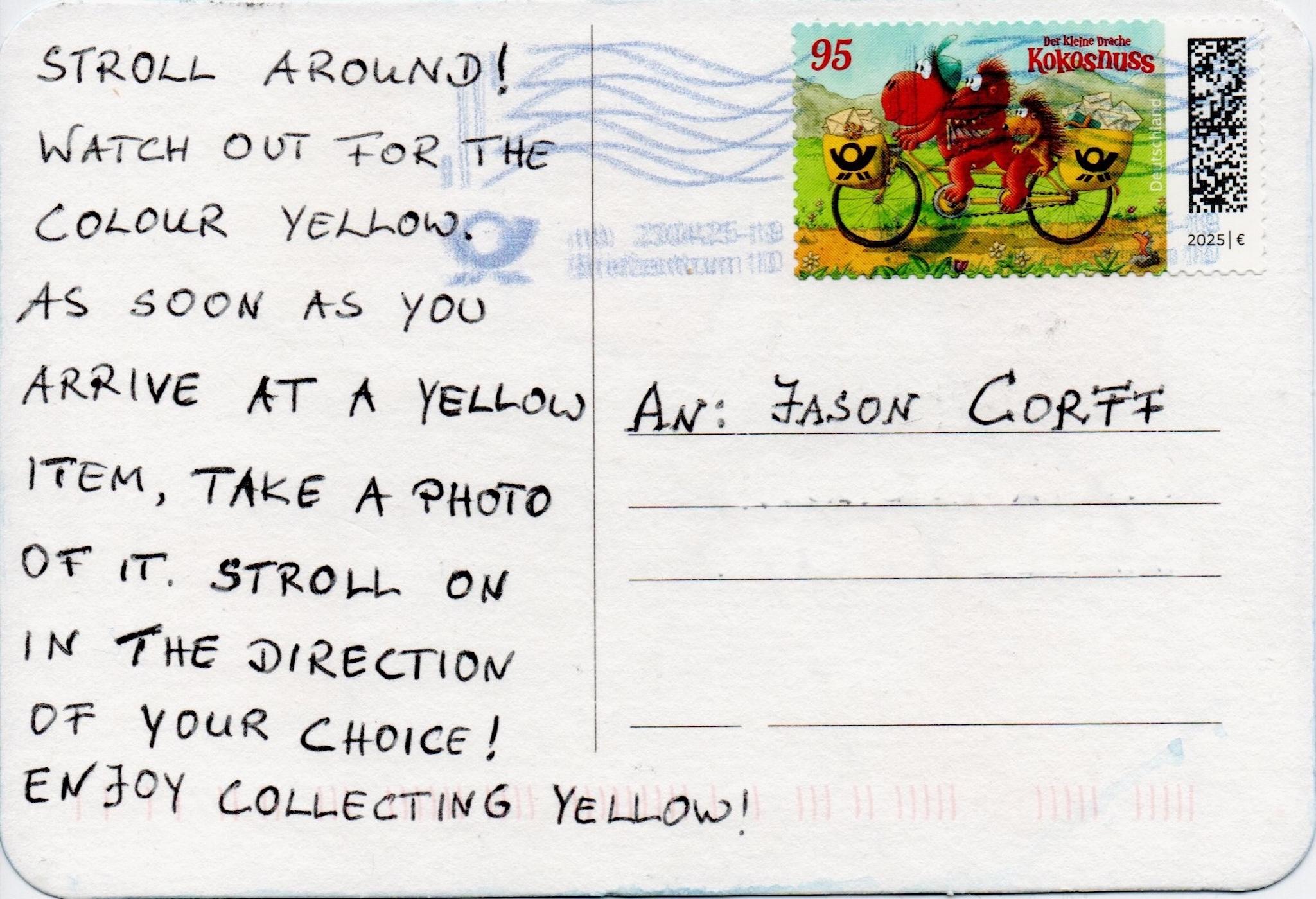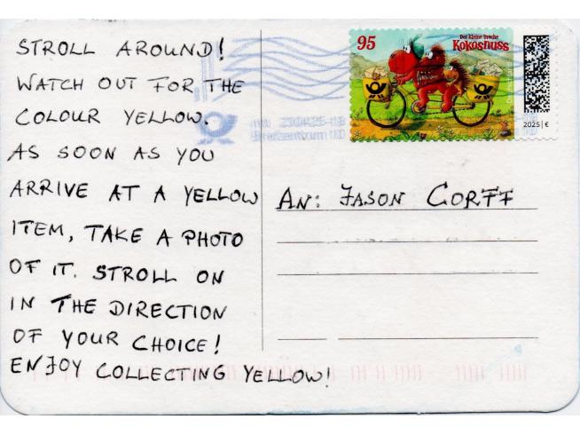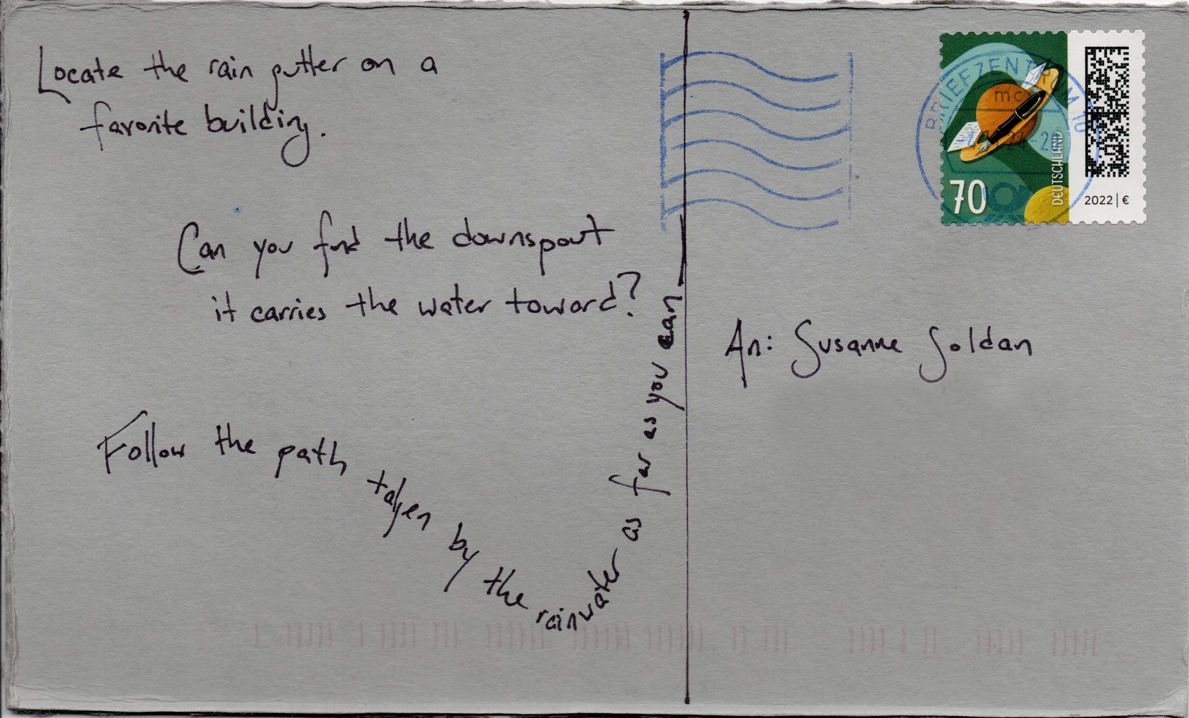 [EN] A playful, artistic critique of tourism and the motif of the postcard, Field Notes from Elsewhere focuses on the unexpected, unique, and subtly spectacular nature of surroundings. Informed by mail art as well as the Situationist and Fluxus movements, the project creates a form of structured drifting. This approach to exploration encourages a participant to perceive (un)familiar places differently than is typical in everyday life. What is uncovered during these actions cannot be predicted in advance, and intends to reveal surprises particular to each location and/or journey. Each Field Note is written with instructions for a task on how to explore or experience your current location in a new way. These handmade postcards are sent via mail between Jason Corff and Susanne Soldan.