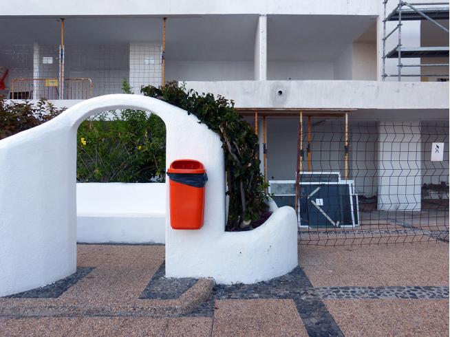 Teneriffa – Graffities im Pool – verkommene Hotelanlage – alter Glanz – Plastikliegen mit Lücken – gefleckter Boden (der Glanz ist ab) – orangener Plastik-Mülleimer auf weißer Wand – daneben Baustelle – geschwungene Mauer(-Landschaft) in orange / Sitzgelegenheiten (der Putz bröckelt) – 70er Jahre Betonbau – hellrosa / rosa / rotes Wandbild – sozialistische Moderne? – grüner /grauer / hellblauer Mauerputz / Zeitschichten – Häuserrückseiten – grob verputzter Beton – Antennen – aufgeräumtes Eck – goldig strahlende Sitzbank – aufstrebende Formen auf Pflanzenkübeln, Kakteen innendrin – Mini-Golf-Anlage in dunkelgrün – und dahinter das Meer – Ball-Auffang-Netz / Schutz-Zaun – schräge Palme – kein Mensch weit und breit.
