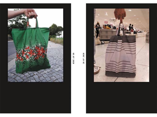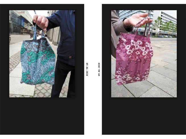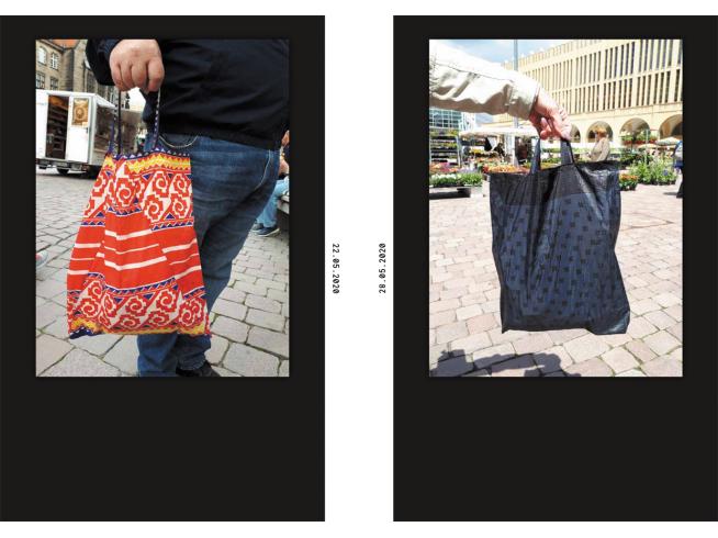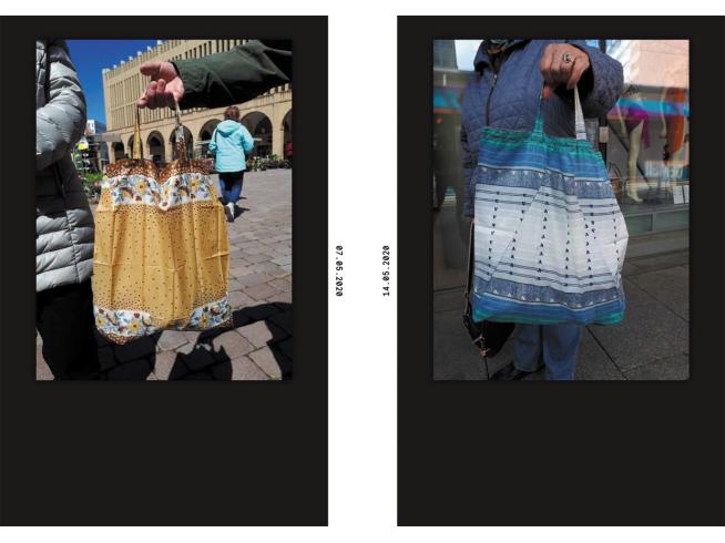 Als geldwerte Leistung für Sonderschichten erhielten die Arbeiterinnen des VEB Schirmfabrik Karl-Marx-Stadt Stoffreste aus zugeschnittener Schirmseide, die aus unterschiedlichen Gründen nicht mehr zu einem Schirm verarbeitet wurden. Aus den Teilen nähten sie u.a. Beutel und verkauften diese für etwa 2 Mark. Seit 2020 fotografiere ich während meiner Spaziergänge über den Chemnitzer Markt sogenannte Schirmbeutel. Mittlerweile ist die Sammlung auf über 150 Beutel unterschiedlicher Dessins angewachsen.