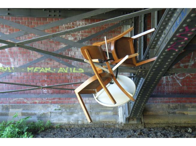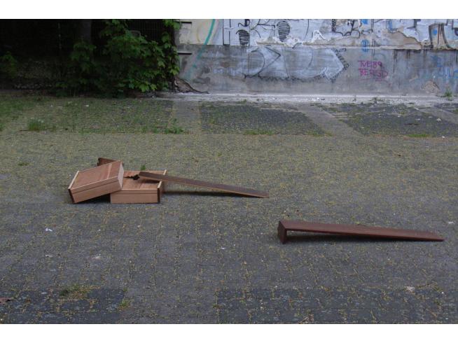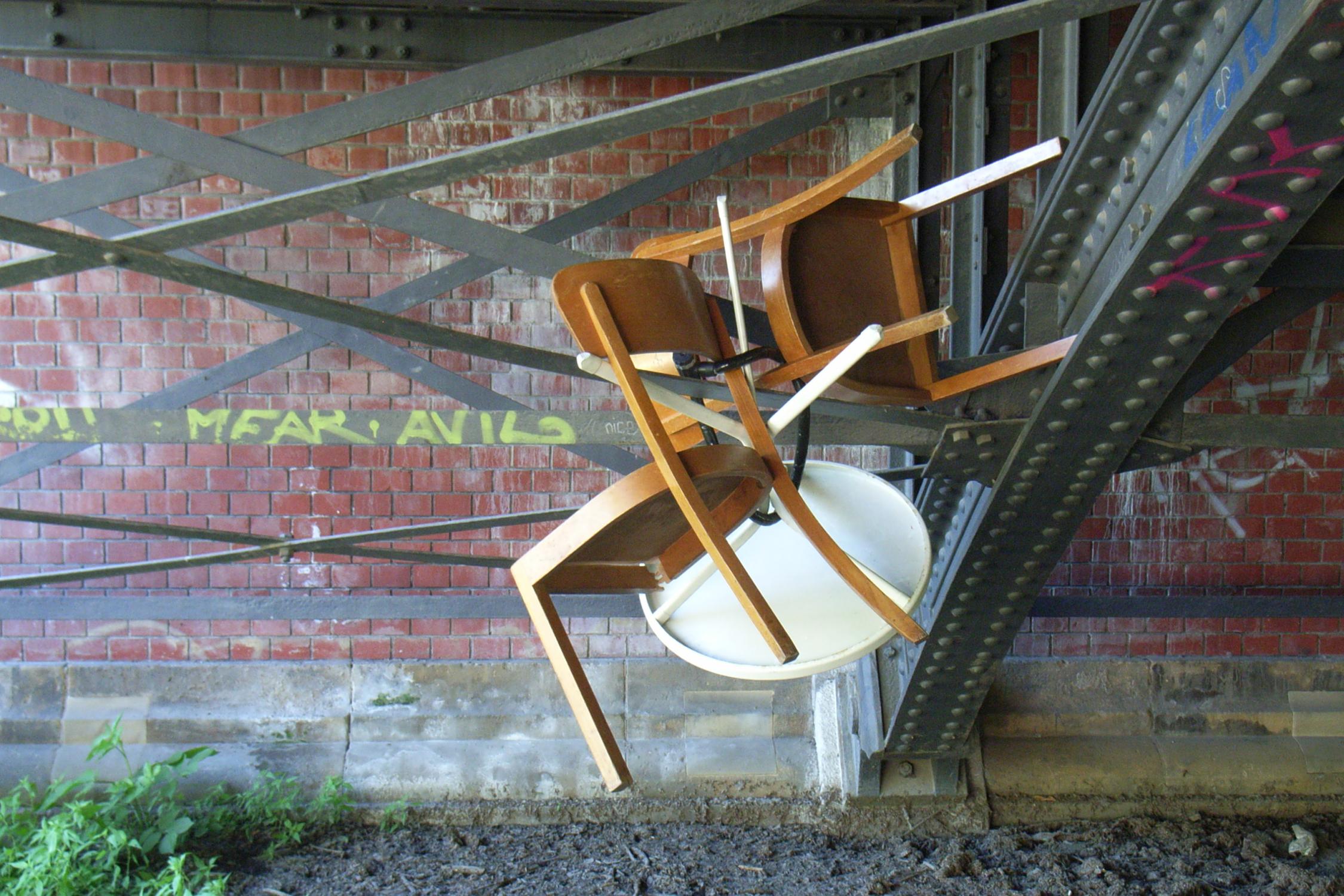 Auf der Straße gefunden: abgehobene Sofas, fliegende Stühle, plattgefahrene Pfeiler, Baustellen, die wie Kunstinstallationen aussehen, Sperrmüll, der zur Skaterrampe wird. Die Funktion der meisten Objekte bleibt im Unklaren, sie schweben zwischen zufällig abgestellt und intentional errichtet; erzählen Geschichten früherer Nutzungen und bieten Platz für neue Aneignungen.
