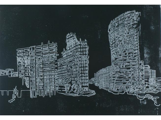 In einer Serie von Drucken aus dem Jahr 2009 deutet er Bauwerke des Potsdamer Platzes in eine fiktive Ruinen-Landschaft um. Dabei bezieht er sich auf eine Tradition der Darstellung von Ruinen, wie den Kupferstichen von Piranesi und den Bildern der Romantik von Caspar David Friedrich und der Malerei von Karl Friedrich Schinkel. Einflüsse der gezeichneten Ruinen der Comic-Kunst wie „Akira“ nutzt Jörn Gerstenberg für seine stilisierten Grafiken. Das memento mori der Ruinendarstellung weist nicht nur auf die Endlichkeit gesellschaftlichen Strebens und geschäftlicher Erfolge hin. Es ist auch ein Spiel mit dem „was wäre wenn….?“ Wie sähen die Gebäude am Potsdamer Platz aus, wenn sie nicht mehr genutzt werden würden? Geschichtlich gesehen ist es noch nicht lange her als der Potsdamer Platz eine reale Ruinenlandschaft war. Die modernen Gebäude des Potsdamer Platzes werden in Jörn Gerstenbergs Bildern zurückgebaut zu einem bildnerischen Verschmelzen von Geschichte und Fiktion.