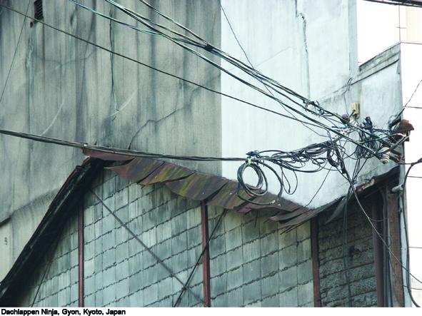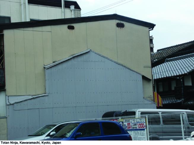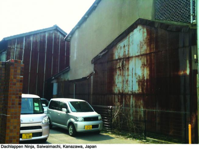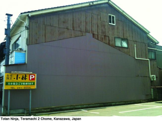 Totan sind die metallenen Wellbleche, mit denen sehr viele Seitenwände von Häusern in Japan verkleidet werden. Meine Erfahrung ist, dass dies die häufigste Form ist, in der man Ninjas antrifft. Die Eigenschaft dieses Materials, das relativ schnell altert, spricht mich sehr an, weil sich dadurch auch der Verlauf der Zeit deutlich abzeichnet, anders als bei langweiligem Beton.