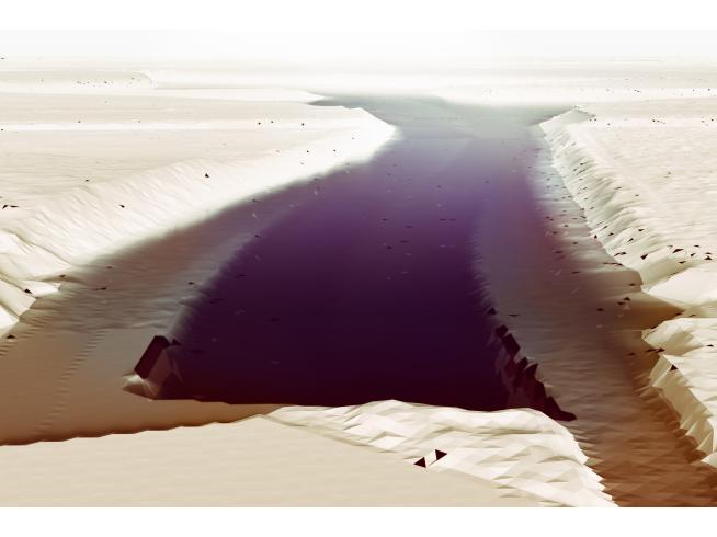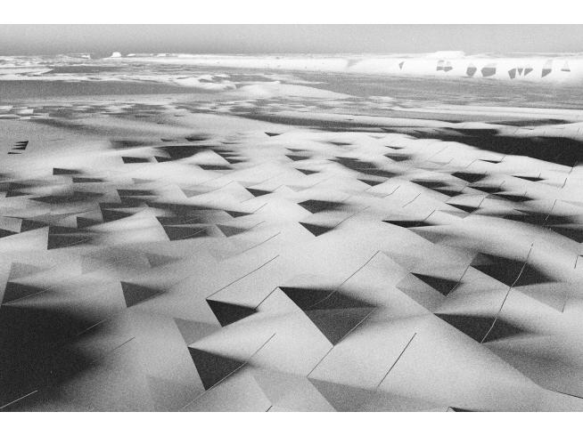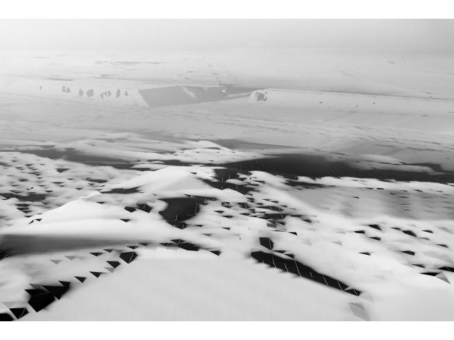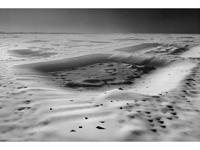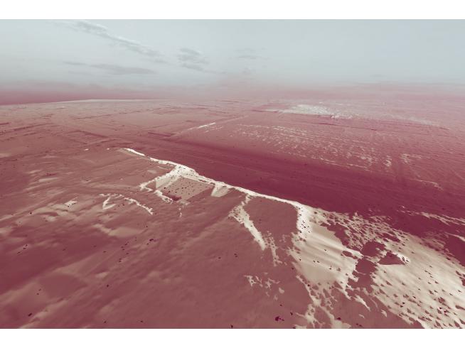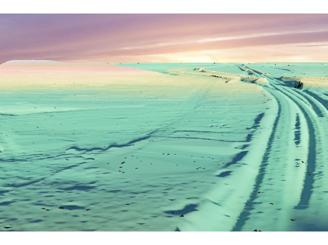 Der Künstler bearbeitet das digitale Material und fügt den Karten Lichtakzente, Schattenwürfe sowie Wolken am Himmel hinzu. Zudem gestaltet er die Grafiken in unterschiedlichen Farben und provoziert auf diese Weise heterogene Assoziationen: mal sieht es nach Mondoberfläche, Schnee- oder Wüstenlandschaft aus. Dabei fallen kleine schwarze Rechtecke ins Auge. Sie markieren Lücken, an denen entweder keine Daten gemessen werden konnten, oder die als Fehler beim Rendern entstehen.