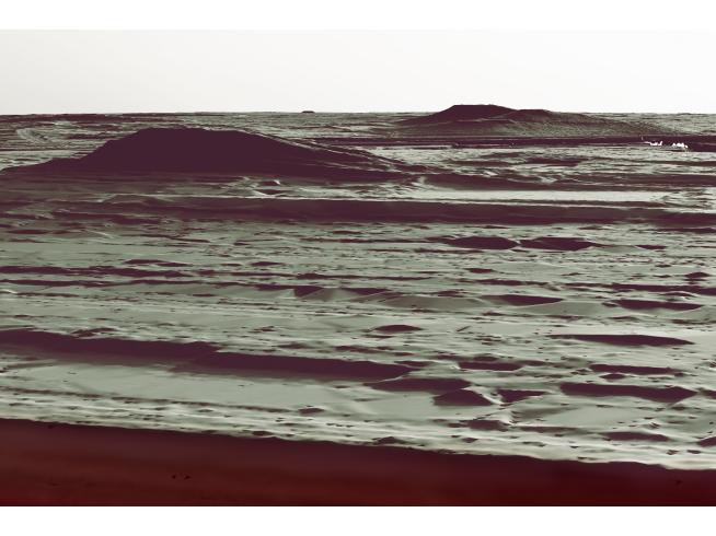Ein weiterer Bearbeitungsschritt besteht darin, dass er die Oberflächen aus unterschiedlichen Perspektiven und Höhen darstellt. Mal ist ein Horizont erkennbar und die Landschaft wirkt extrem flach, bei anderen werden kleine Ausschnitte heran gezoomt und die Höhenunterschiede treten hervor. Auf einer Grafik wird so nah an die Oberfläche heran gezoomt, dass sie wie gerastert wirkt. Durch die Vergrößerung wird das Bild extrem pixelig, so dass die digitale Quelle überdeutlich wird.