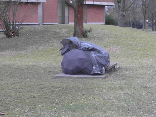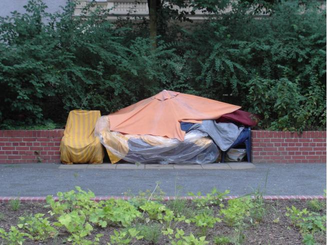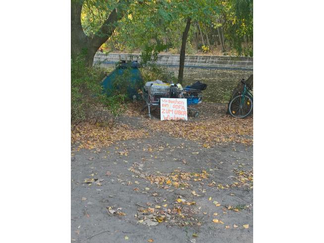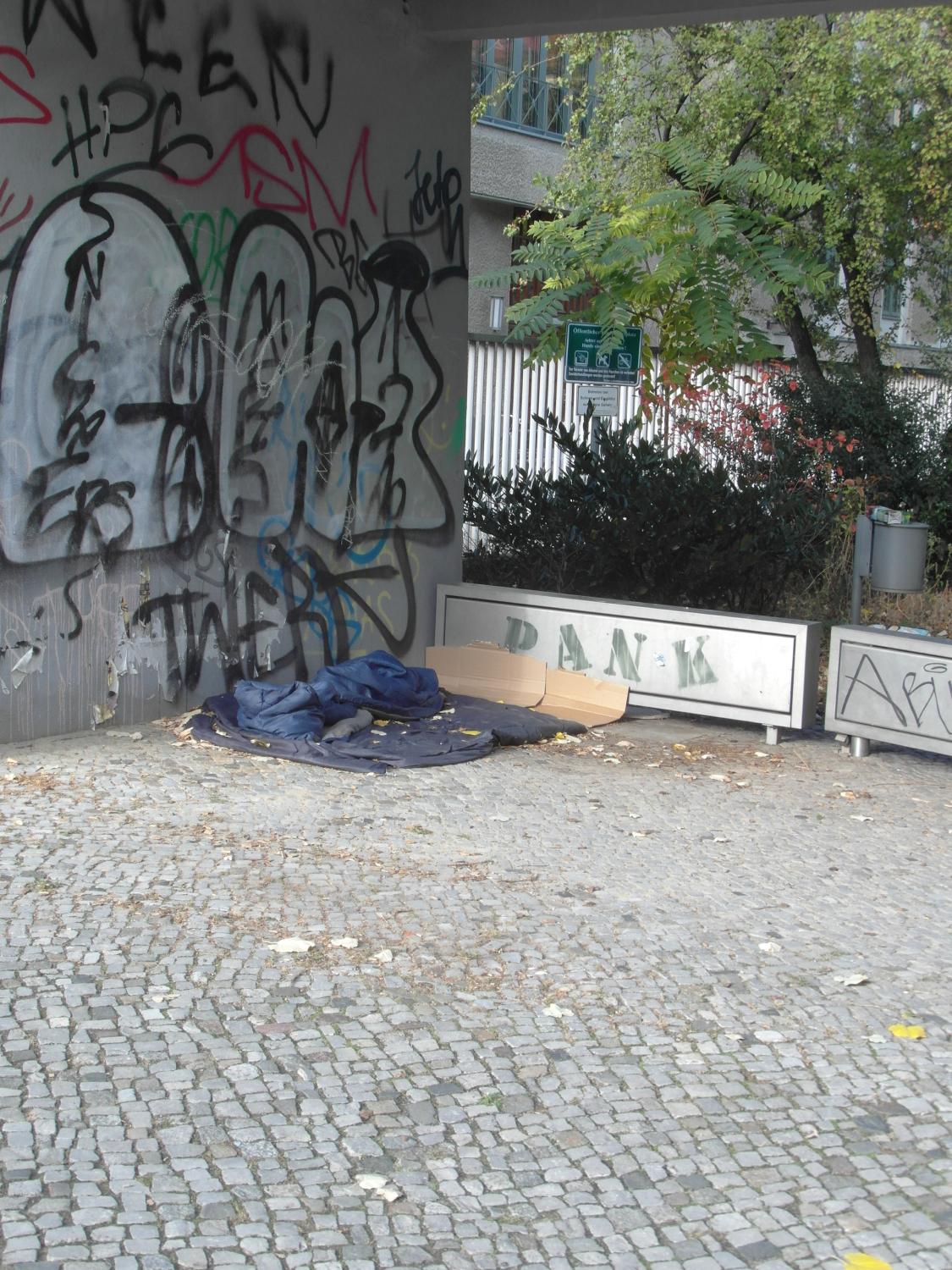 Auch wenn bei diesen Unterkünften das klassische Dach meistens fehlt, handelt es sich um Schlafplätze von Menschen. Manche sind sehr gut zugänglichen, andere etwas versteckter, aber die meisten befinden sich an erstaunlich öffentlichen Orten, wie dem Französischen Dom, dem Kulturforum, dem Görlitzer Bahnhof oder dem Park um die Ecke. Die Öffentlichkeit kann zur Bedrohung werden, aber in den meisten Fällen bietet sie auch Schutz. Entscheidend ist, dass die Obdachlosenbleiben von Gärtner*innen, Sicherheitsdiensten oder Anwohner*innen geduldet werden, dann kann so etwas wie eine provisorische Ko-Existenz entstehen.