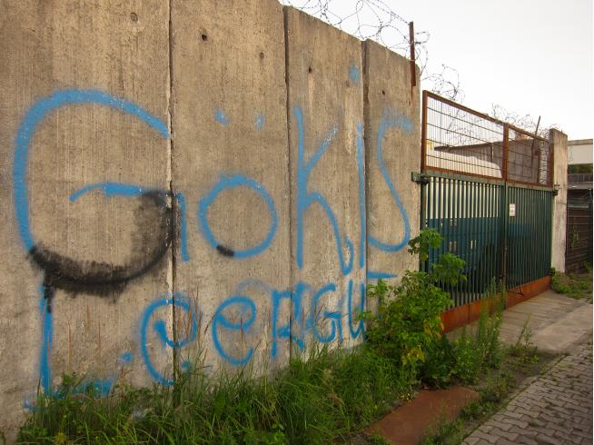 Unser Spaziergang beginnt östlich vom U-Bahnhof Schlesisches Tor. Eine Kreuzung trennt sie von der Schlesischen Straße, die schon seit einigen Jahren mit ihren Clubs im typischen Bretterbuden-Stil das Image Berlins als alternative Partyhauptstadt an junge Touristen verkauft, die den Underground suchen, aber dort nur ein touristisches Disneyland finden. Die Köpenicker Straße beginnt dagegen unaufgeregt, ohne sichtbare Spannungen oder Brüche, nimmt dann aber den Verlauf einer Fieberkurve: sie steigt bis zum Höhepunkt, um dann mit einigen Ausschlägen wieder abzuflauen. Nach ein paar Metern auf ihrer Spreeseite verkündet über einem wild bewachsenen Areal ein Schild mit bunten handgeschriebenen Lettern den Zirkus „Schatzinsel“. Der „Verein zur Überwindung der Schwerkraft“ verfolgt das Ziel, „Kindern und Jugendlichen in Berlin-Kreuzberg den Freiraum [zu] geben, ihre Ideen zu verwirklichen, Initiative zu entwickeln, sich auszuprobieren und einfach Circus zu machen.“ Ein Relikt aus den Zeiten, in denen Kreuzberg für seine alternative Lebenskultur, für Selbstorganisation und anti-autoritäre Strukturen bekannt war.