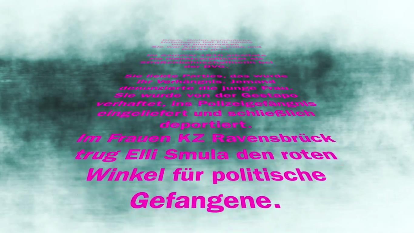 Elli Smula arbeitete als dienstverpflichtete Straßenbahnschaffnerin bei der BVG. Sie trägt den roten Winkel für politische Gefangene im Frauen KZ Ravensbrück. In der Zugangsliste vom 30. November 1940 hat sie die Nummer 11 mit dem Zusatzvermerk: lesbisch. Die junge Frau stirbt im KZ unter ungeklärten Umständen. Für Elli Smula hat Marion Fabian erstmals eine visuelle Übersetzung der aktustischen Stolpersteine entwickelt, die hier angeschaut werden kann.
