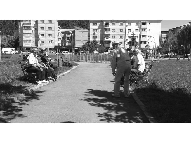 Die sozialen Verbindungen werden verstärkt im Park deutlich. Jeden Nachmittag bei gutem Wetter trifft sich eine Gruppe Rentnerinnen auf »ihren« zwei ganz bestimmten Bänken im zentralen Park. Sie tauschen sich über ausgewanderte Kinder oder Verwandte aus. An einem Nachmittag erzählt eine Frau von einem benachbarten Wohnblock, in dem eine 84-jährige Frau alleine wohnt. Auf dem Flur sind während des letzten Jahres alle Glühbirnen ausgebrannt und die einzige Bewohnerin ist zu alt, um diese zu wechseln. Außer den Einwohnerinnen aus dem benachbarten Wohnblock besucht sie niemand. In ihren Gesprächen zeigen die Frauen eine starke soziale Verbindung zu ihrer Verwandtschaft im Ausland, aber auch zu ihrer Nachbarschaft. Das gemeinsame Warten im Zentrum gibt die Möglichkeit zum Austausch untereinander. Die Kontakte zum Ausland verbinden auch die Personen in Comănești und erlauben es, die Erfahrung von translokalen Verbindungen zu teilen.