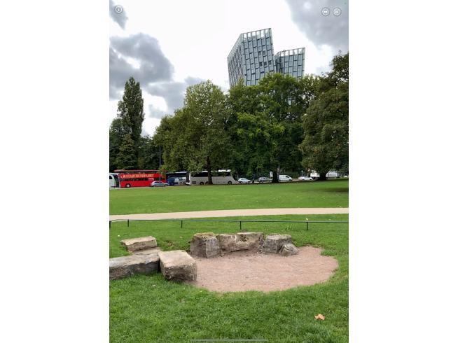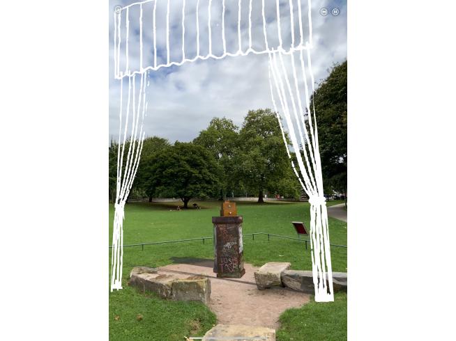 Ein Passant kommt mit seinem Hund vorbei, der schnüffelt neugierig am Zaun und hebt kurz sein Hinterbein. Ich bin mit Eske Schlüters und Tillmann Terbuyken hier verabredet, die Künstler sind dafür verantwortlich, dass sich diese Installation hier befindet. Sie haben ein Tablet und Kopfhörer mitgebracht, denn bei Untitled History handelt es sich um eine zweiteilige Arbeit, aus einem physischen und einem digitalen Teil. Auf dem Tablet ist die Augmented Reality-App bereits installiert, die ich sonst über den QR-Code herunterladen könnte. Mit dem Öffnen der APP beginnt eine ca. 15 min virtuelle Reise, bei der sich vor mir historische Gebäude und Phantasiegebilde aufbauen, um im nächsten Moment wieder zu verschwinden. Es ist eine eigenartige Erfahrung: Auf dem Tablet sehe ich den realen Umraum, der zugleich Schauplatz einer künstlerischen Zeitreise ist. Gleichzeitig spüre ich die Blicke von Passant*innen auf mir – kein Wunder, so ungewohnt, wie ich mich hier (nicht-)bewege.