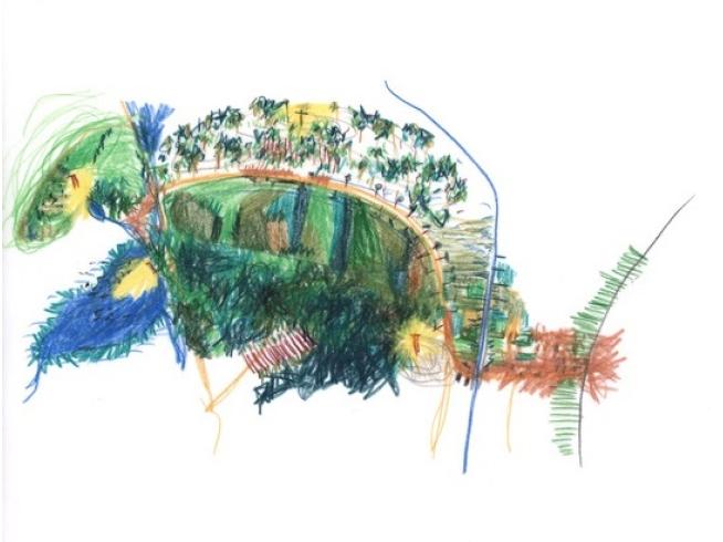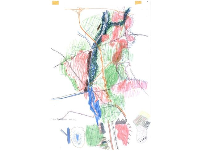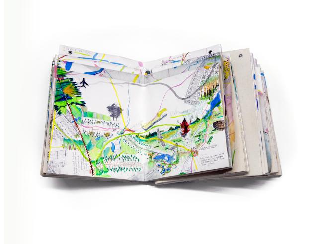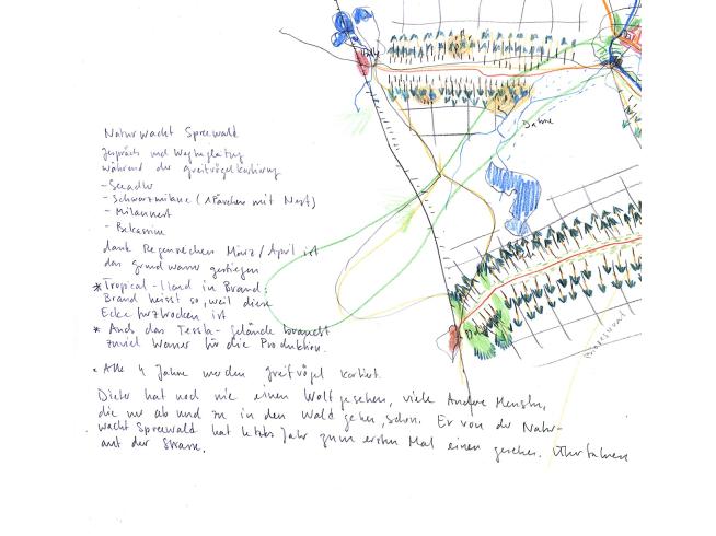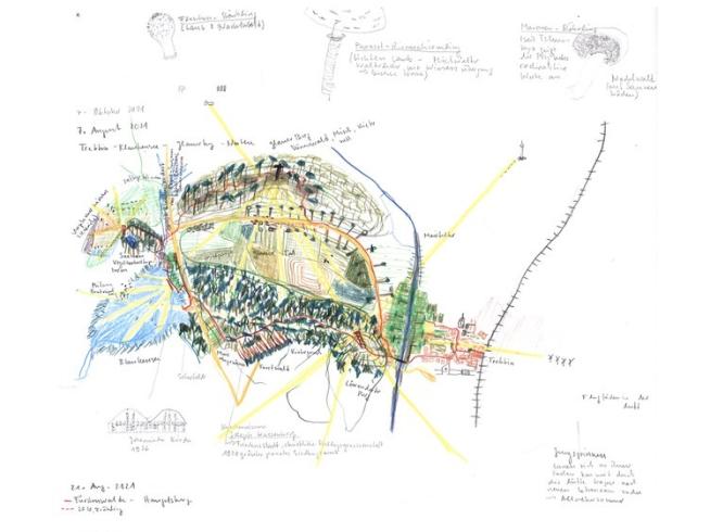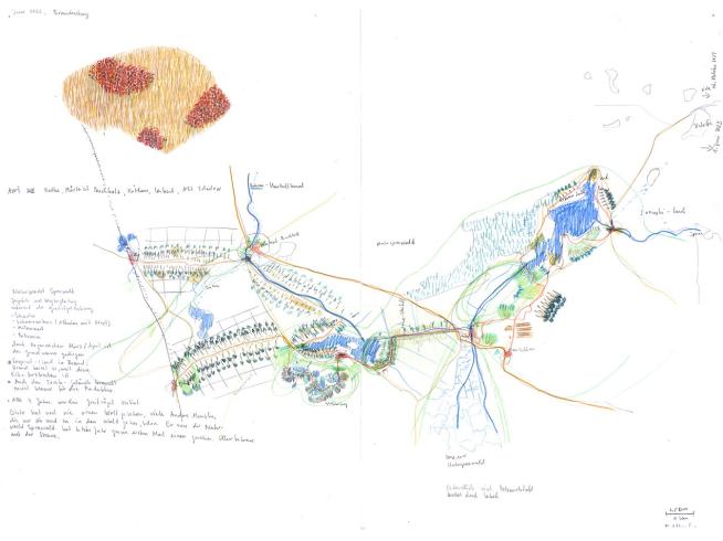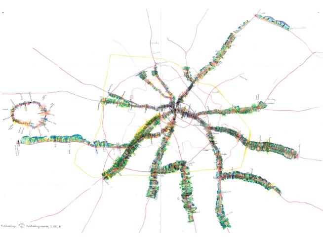 EE: Währen der Wanderungen hielt ich meine Eindrücke unmittelbar mit Bleistift, Buntstift, Aquarell und Wachspastell auf A2-grossen Arbeitsblättern fest. Anschließend übertrug ich die Skizzen und Notate auf eine 220 x 300 cm große Zeichnung mit dem Titel „Berlin Umrundungen“.