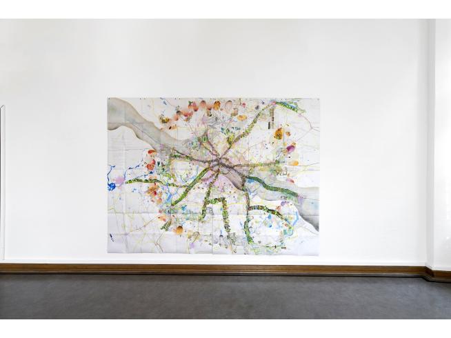 8: Ausstellungsansicht Helmhaus Zürich, 2025, „Berlin Umrundungen“, 220 x 300 cm, Bleistift, Buntstift, Tusche, Wachspastell auf gefaltetem Papier, kaschiert auf Leinen, Foto: Zoe Tempest