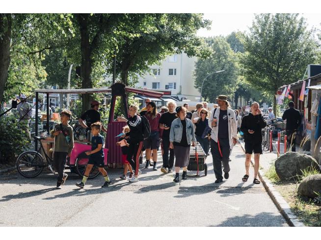 Wir waren sehr glücklich über den Verlauf dieses Experiments, das sich zu einem situationistisch aufgebohrten Stadtteilrundgang ausgewachsen hatte. Es war schön, wie unsere komplizierten kleinen Geheimpfade – durch die Büsche, den Deich hinauf, die Schutzwand herab, dann durch den Zaun … – von drei Dutzend gut gelaunten Stadtteil-Entdecker:innen ganz selbstverständlich benutzt wurden. Es war lustig, zu erleben, wie unsere Besucher:innen sich noch bei der Party am Abend auf englisch Bilder von unserm „Fig-Tree“ zeigten, dem irgendwie geheimen Feigenbaum in der Stresowstraße. Davon blieb etwas im Viertel haften, jedenfalls bei allen Rothenburgsorter: innen, die dabei waren: Das Gefühl, dass unsere Spaziergänge, unsere alltäglichen Wege und Beobachtungen relevant sind. Die Erfahrung, dass es sich lohnt, sie aufmerksam zu gehen; das Wissen, dass sie in eine kollektive Erfahrung einfließen können, die dann womöglich eine eigene Dynamik, eine verändernde Kraft entwickelt. Denn das war vielleicht die wichtigste Erfahrung aus der Rothenburgsorter Umherschweifung: die so charmante wie kreative Unaufhaltsamkeit von zwanzig, dreißig, vierzig Menschen, die miteinander verbunden durch den Stadtteil schweifen; die kollektive, spielerische Herstellung einer Situation, die das Potenzial nachbar:innenschaftlicher Praxis greifbar werden lässt und eine Ahnung von Aktion und Veränderung erlaubt.