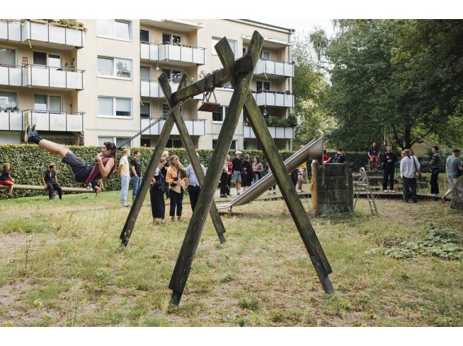 Ein Spielplatz mitten im Wohnquartier Stresowstraße gab Gelegenheit, die Stärke dieses Selbstverständnisses zu demonstrieren: Seit dem Corona-Lockdown im Frühjahr 2022 war das reizende kleine Areal, auf dem Spielgeräte in einen Skulpturenpark eingebettet sind, zugesperrt, das Betreten per Schild verboten. Inzwischen längst nicht mehr wegen der Pandemie, sondern – gerüchteweise, vermutlich – aufgrund der Verschleppung einer technischen Abnahme durch die örtliche Wohnungsgesellschaft. Die Gruppe war gegenüber dieser Aussperrung uneinsichtig. Mehr oder weniger sportlich, mit gegenseitiger Hilfe und der praktischerweise mitgeführten Trittleiter überwand man den Zaun fast beiläufig und begann, sich im Spielplatzgehege umzutun. Drei Dutzend Menschen, die sich auf dem verwaisten Spielplatz tummelten, blieben an diesem warmen Sommernachmittag auf den angrenzenden Balkons nicht unbemerkt, und schnell entwickelte sich ein Dialog zwischen Umherschweifenden und Anwohner:innen über die Situation. Dessen Tenor: „Wisst ihr, warum der überhaupt noch zu ist? Wir wollen unseren Spielplatz wiederhaben!“ von oben. „Nee, wissen wir nicht wirklich. Ihr auch nicht? Also wenn jemand die Tore knackt, will ich mitmachen“ von unten.