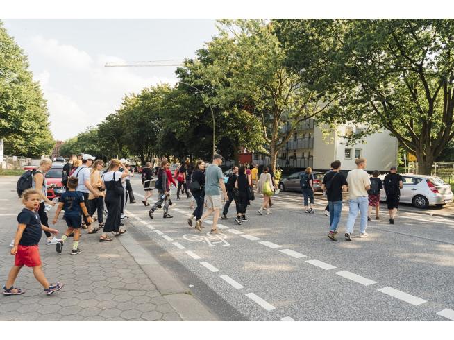 Die Leute hatten unverkennbar ihren Spaß an der Stadt-Erkundung, sie waren neugierig und wollten miteinander reden. Da waren Stadt- und Stadtteil-Aktivist:innen von außerhalb mit je eigenem Selbstverständnis von Aneignung und Aktion; da waren Hamburger:innen, gespannt auf unseren Stadtteil und seine Eigenheiten; und da waren die Rothenburgsorter:innen, die sich alltäglich im Quartier bewegen, die in ihren Nachbarschaften Veränderungen miterleben, Geschichten aufschnappen. Was immer unsere Vorstellung des Rundgangs gewesen war, ab hier klickte die Gruppe und übernahm die Erkundung als kollektives Vorhaben, als reales Spiel einer gemeinsamen Entdeckungsreise.