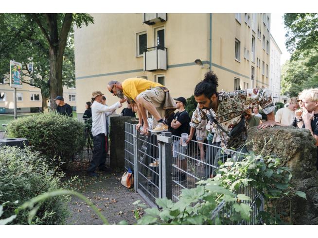 Ein Spielplatz mitten im Wohnquartier Stresowstraße gab Gelegenheit, die Stärke dieses Selbstverständnisses zu demonstrieren: Seit dem Corona-Lockdown im Frühjahr 2022 war das reizende kleine Areal, auf dem Spielgeräte in einen Skulpturenpark eingebettet sind, zugesperrt, das Betreten per Schild verboten. Inzwischen längst nicht mehr wegen der Pandemie, sondern – gerüchteweise, vermutlich – aufgrund der Verschleppung einer technischen Abnahme durch die örtliche Wohnungsgesellschaft. Die Gruppe war gegenüber dieser Aussperrung uneinsichtig. Mehr oder weniger sportlich, mit gegenseitiger Hilfe und der praktischerweise mitgeführten Trittleiter überwand man den Zaun fast beiläufig und begann, sich im Spielplatzgehege umzutun. Drei Dutzend Menschen, die sich auf dem verwaisten Spielplatz tummelten, blieben an diesem warmen Sommernachmittag auf den angrenzenden Balkons nicht unbemerkt, und schnell entwickelte sich ein Dialog zwischen Umherschweifenden und Anwohner:innen über die Situation. Dessen Tenor: „Wisst ihr, warum der überhaupt noch zu ist? Wir wollen unseren Spielplatz wiederhaben!“ von oben. „Nee, wissen wir nicht wirklich. Ihr auch nicht? Also wenn jemand die Tore knackt, will ich mitmachen“ von unten.